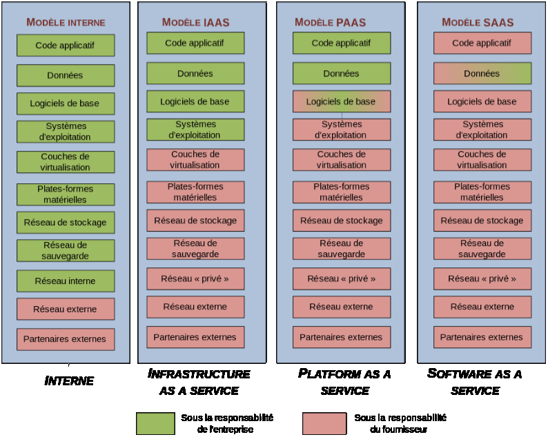 Cette représentation des différents modèles de service montre comment les responsabilités sont théoriquement réparties suivant les modèles internes, IaaS, PaaS, SaaS.